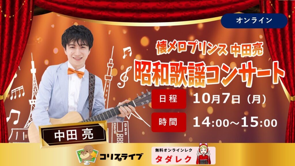 コリスライブ主催「昭和歌謡コンサート」の無料開催が10月も決定いたしました!今回もタダカヨ様とのコラボ開催で参加費は無料です!下記ページよりお申し込みください! お申し込みページ -