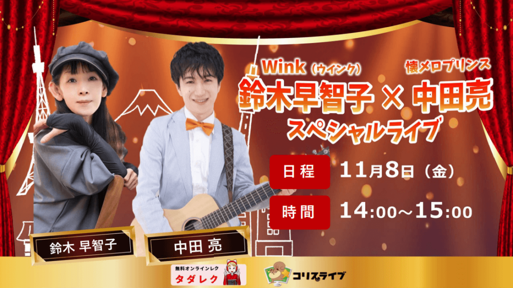 コリスライブ主催「昭和歌謡コンサート」の無料開催が11月も決定いたしました!今回もタダカヨ様とのコラボ開催で参加費は無料です!更に今回はWink 鈴木早智子さんをゲストに迎えスペシャルライブをお届けいたします。Winkの大人気ヒット曲「淋しい熱帯魚... -