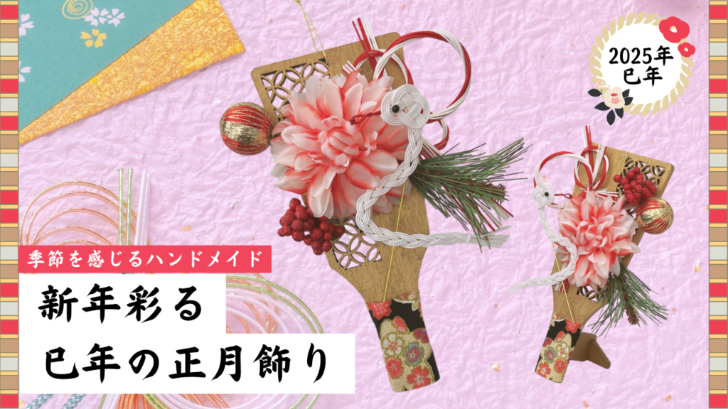 羽子板の土台に2025年の干支、へびのパーツや鮮やかな紅白の水引きを飾る正月飾りです。松・南天・毬など縁起の良い装飾で豪華な仕上がりになります。立てても壁飾りにも使用できるタイプです。パーツは全て加工済!オリジナルのアレンジをお楽しみくださ... -