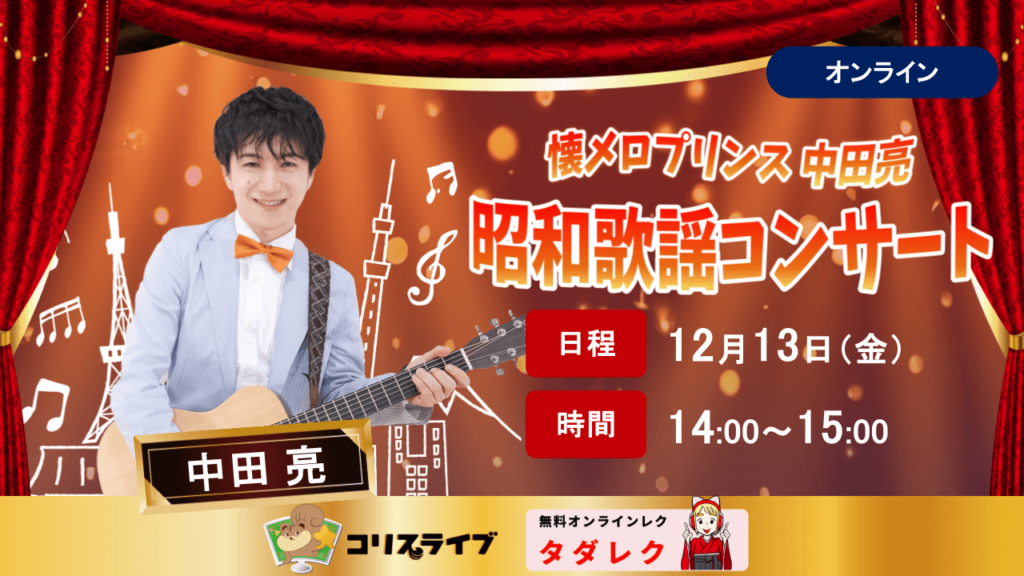 コリスライブ主催「昭和歌謡コンサート」の無料開催が12月も決定いたしました!今回もタダカヨ様とのコラボ開催で参加費は無料です!下記ページよりお申し込みください! お申し込みページ -